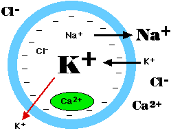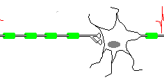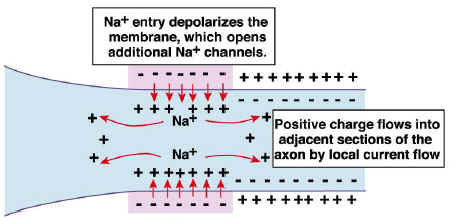 Neurons convey information to other neurons by means of the generation of "action potentials." When electro-chemical stimulation of a neuron exceeds a certain critical threshold, a sodium (NA+) - potassium (K+) chemical pump changes the polarity, the distribution of electrical charges, across the cell membrane of the neuron. The result is a pulse-like wave of electrical energy that travels through the cell body and down a long projection called the axon.